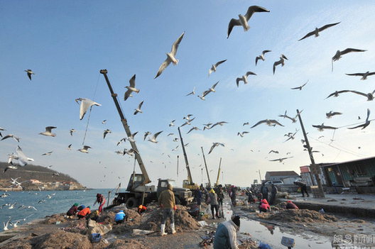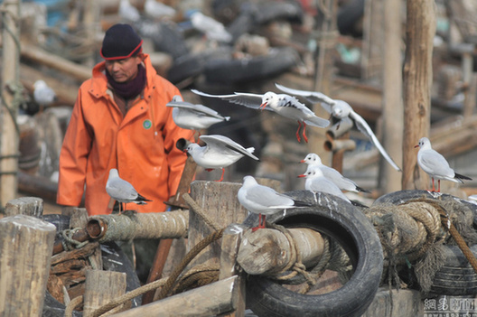 2016年11月23日,山东省青岛市白天气温降至-1.7℃低温,受冷空气影响,浅水鱼虾减少,大批越冬的海鸥集中在渔港附近与人抢食海鲜,以补充体能躲避严寒。据青岛市气象台信息,当日16时00分继续发布大风蓝色预警信号:受冷空气影响,预计今天下午到明天上午,我市北风风力陆地可达4~5级阵风7级,海上6~7级阵风9级。夜间温度降至-2 ℃。2016年11月23日,山东青岛,越冬红嘴鸥跟随进港的渔船抢食鱼虾。图片来源:视觉中国王海滨/视觉中国