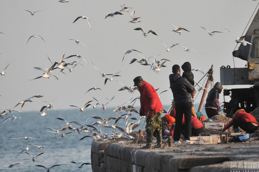 山东青岛越冬海鸥扎堆 与市民抢食鱼虾
