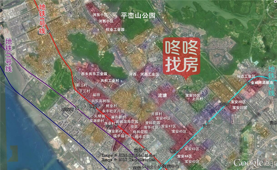 新安和西乡板块:基本是按规划公示的红色部分标识的,旧工业区聚集或夹杂的区域居多,可以根据已标注楼盘建筑识别。西乡、坪洲、翻身地铁口周边值得特别关注。
