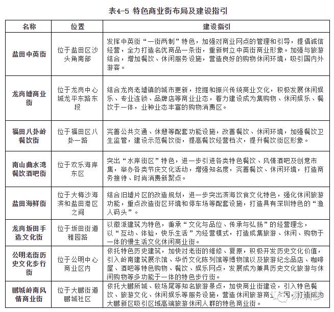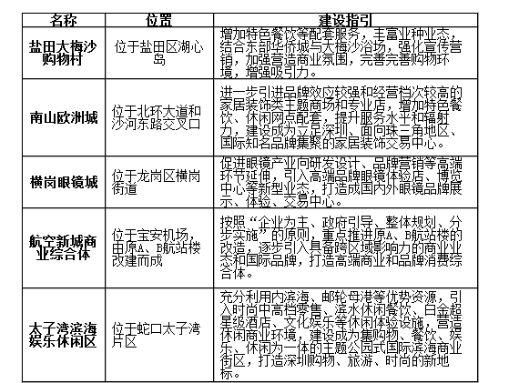 特色商业街区 | 特色商品或服务消费 | 在功能上以满足特定消费群体对特定商品或服务的选择性需求;以特定的产业或人文特色为支撑,具有相同特点的商业一定程度集聚,以零售或餐饮功能为主,兼具配套和少量批发功能。 | 特色商业街商业网点在空间上呈线状分布,以零售和餐饮为主,业态上以主题商城、专业店和专卖店为主。特色商业区商业网点在空间上呈组团式集聚,所经营商品一般不超过3大类,主要品类或服务网点比例超过50%,业态上以主题商城、专业市场、专业店和专卖店为主。 | 特色商业街(8个):盐田中英街、龙岗墟商业街、福田八卦岭餐饮街、南山曲水湾餐饮酒吧街、盐田海鲜街、龙岗坂田手造文化街、公明老街历史文化步行街、鹏城岭南风情商业街; 特色商业区(5个):盐田大梅沙购物村、南山欧洲城、龙岗横岗眼镜城、航空新城商业综合体、太子湾滨海娱乐休闲区 |