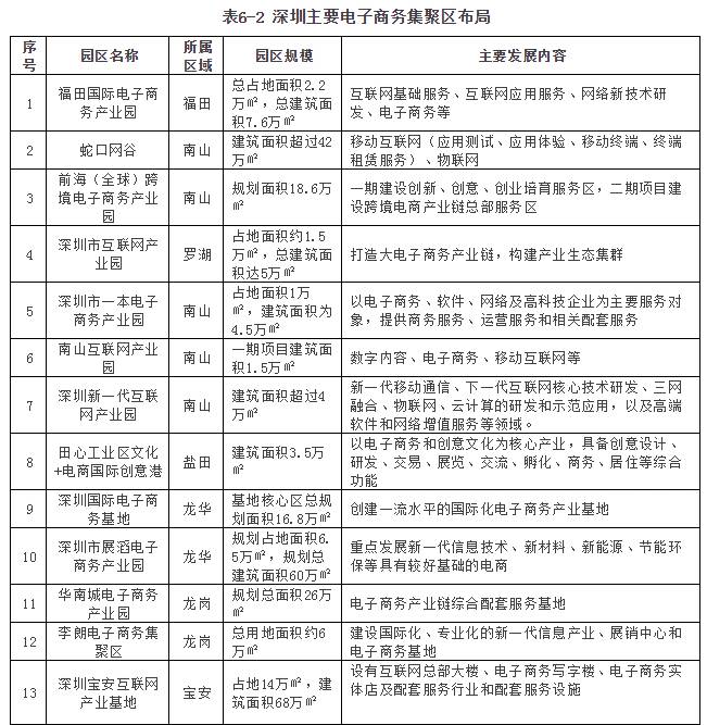 依托福田国际电子商务产业园、蛇口网谷、前海(全球)跨境电子商务产业园3个国家电子商务示范基地及其他电子商务产业园区,加快深圳电子商务聚集发展。吸引与电子商务发展紧密相关的网络技术、数据分析、信用认证、网络推广、管理咨询、在线培训等第三方服务入驻集聚区,构建电子商务产业生态链,进一步促进电子商务创新发展,推动新商业模式在商贸领域的应用。