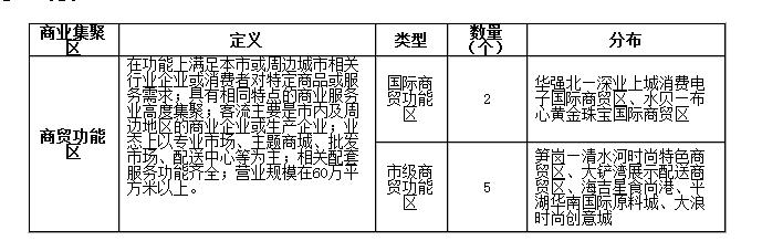 区级 商业中心 | 一站式购物 | 商业集聚度较高,以零售功能为主,经营品种品类齐全,满足本地居民一次性购满购足的一站式购物需求。商业面积5万平方米以上;服务人口逾5万人,年营业额超过8亿人民币,客流以本区或周边几个街道居民为主体。 | 鼓励发展的业种业态:社区型购物中心、百货店、品牌专卖店、专业店、餐饮娱乐网点、文化休闲网点;控制发展的业种业态:大型商品交易市场、仓储式商场、大型综合超市等。禁止发展的业种业态:农贸市场(对已有的农贸市场,应进行升级改造)、旧货市场。 | 东园路、深南东、梅林、南头、南油、西丽、华侨城、蛇口、盐田、西乡、新安、沙井、龙岗墟、布吉、坂田、横岗、光明新中心、坪山新中心、葵涌、观澜等商业中心(20个) |