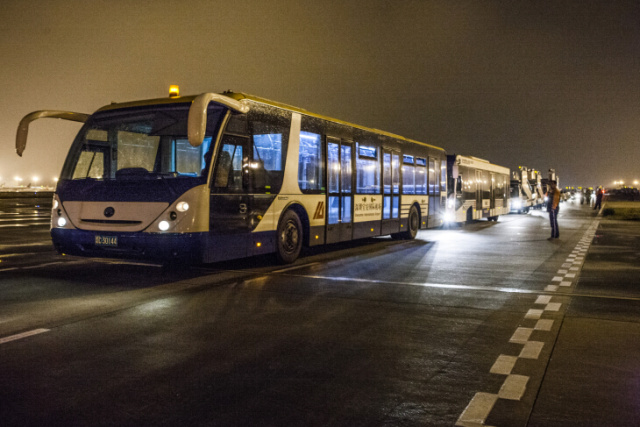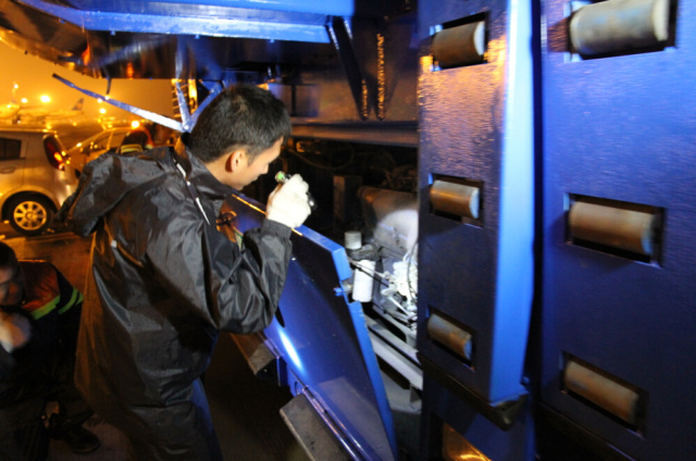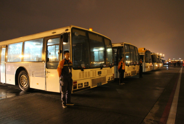 23时左右,车辆抵达新航站楼后,工作人员检查确认车辆状况。