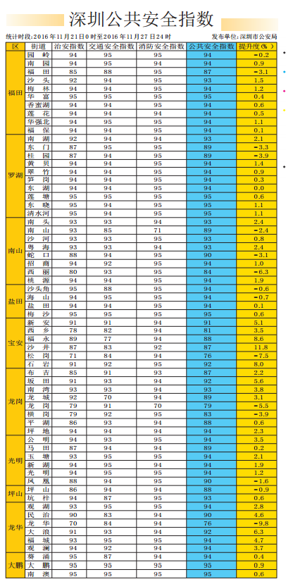 深圳公共安全指数第35期发布 宝安龙华各有一处垫底