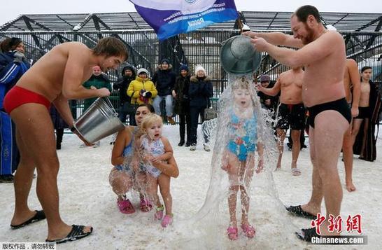 当地时间2016年11月27日,俄罗斯克拉斯诺雅茨克,冬泳俱乐部成员在零下5℃的雪地中挑战冰桶,庆祝北极熊日。