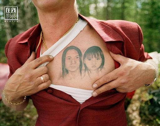 Stefan在胸口纹了自己妻子和女儿的纹身,瑞典Fredrika市,2008年。