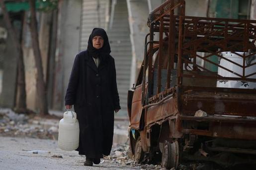 一位妇女拿着装水的容器经过一辆被烧焦的小货车。