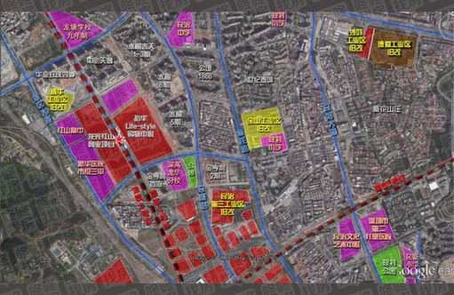2、旧改图片中,黄色代表住宅用地,红色代表商业用地,棕色代表工业用地,绿色代表公园用地,玫红代表学校、医院之类的公共配套设施;