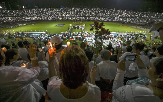 北京时间12月1日上午7点45分,这本应是沙佩科恩斯与国民竞技的比赛时间,但由于沙佩科恩斯在奔赴客场途中遭遇空难,这场南美杯决赛的首回合也无法如约进行。但到了比赛的时间,在国民竞技的主场内依旧坐满了观众。他们全部穿着白衣来到现场,为这场可能再也无法进行的比赛助威,也为在坠机事故中遇难的沙佩科恩斯球队祈祷、默哀。视觉中国