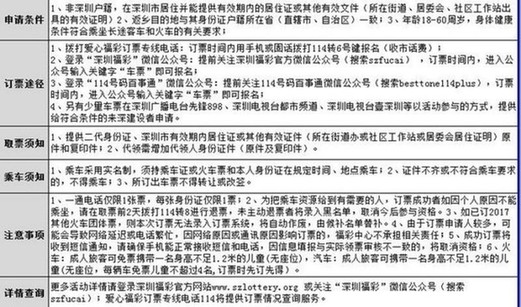 为了提供专业的订票及咨询服务,更方便来深建设者预定车票,深圳福彩中心将提供两条渠道进行订票,除了传统的福彩专线电话(114)订票,还可以通过福彩官方微信(微信号:szfucai)来抢订车票。一次拨打福彩电话专线114号码订票仅限1人,1人仅限一票。车票先订先得,满额为止。
