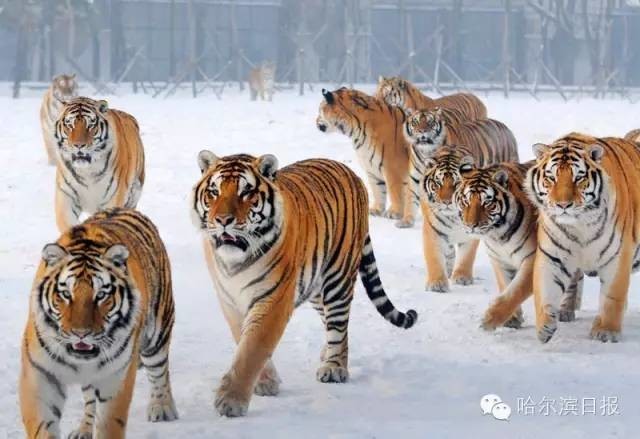 几场大雪过后,黑龙江哈尔滨东北虎林园内的东北虎显得格外精神,成群结队地在雪地嬉戏。