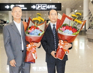首届全国文明家庭表彰大会昨在京举行。图为全国文明家庭代表陈如豪(左)、韩世国(右)回到深圳,受到热情迎接。记者程海昆 摄
