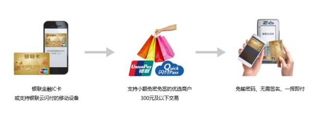 小额免密免签是中国银联为持卡人提供的一种小额快速支付服务。2015年 11月2日,中国银联宣布,银联卡小额免密免签服务正式试点推出。当持卡人使用带有 “闪付”(QuickPass)标识的银联芯片卡或移动支付设备,在指定商户进行一定金额(境内300元人民币,境外以当地限额为准)及以下的交易时, 只需将卡片或移动设备靠近POS机等受理终端的“闪付”感应区“挥卡”,即可完成支付。支付过程中,您不会被要求输入密码,也无需签名。您使用银联芯片信用卡“小额免密免签”功能进行的交易将作为消费类交易计入信用卡账户。