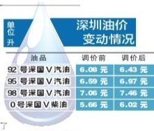 记者从中石化深圳石油公司了解到,本次涨价后,深圳92号国V汽油价格由6.08元/升上调至6.43元/升,每升上涨0.35元;95号国V汽油价格每升由6.59元上调至6.97元,每升上涨0.38元;98号国V汽油由7.06元/升上调至7.46元/升,每升上涨0.4元;深国V 0号柴油从5.66元/升上调至6.02元/升,每升上涨0.36元。