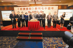 梁振英、杨健、宋如安、李小甘等主礼嘉宾,与陈寅一起切蛋糕,共贺导报70岁生日。陈寅并致祝酒词:“为《经济导报》再创辉煌,为各位平安健康,干杯!”