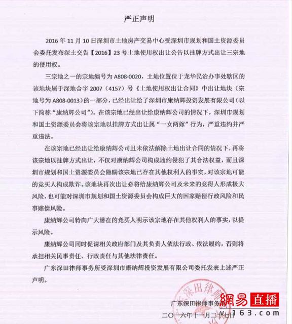 记者在网上查到相关公司委托律师事务所发出的声明。声明中提到,该宗地块已出让给康*辉公司的情况下,规土委将该地块以挂牌方式出让属一女两嫁行为,严重违约并且严重违法。声明提醒说,地块出让对康*辉公司及未来的竞得人形成极大风险,也可能对深圳市规土委构成巨大的国家赔偿行政风险和民事赔偿风险。