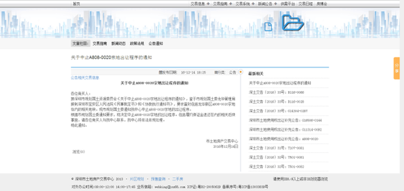 12月14日18时25分,土地房产交易中心发布一则给各竞买人的通知,通知中公布了该宗地块中止出让的原因——宝安区人民法院要求查封包括龙华新区A808-0020宗地在内的相关地块。