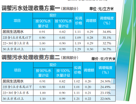 综合污水处理收费标准由0.94元/立方米调整到1.29元/立方米,其中,非居民用水污水处理费按照国家要求的最低标准1.4元/立方米征收,居民用水污水处理费作相应调整。