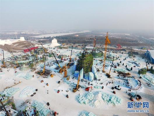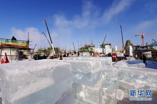 在哈尔滨冰雪大世界园区,工人们在进行冰建筑施工(12月12日摄)。