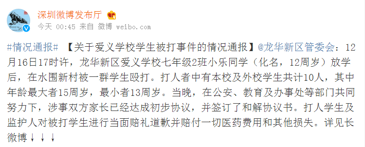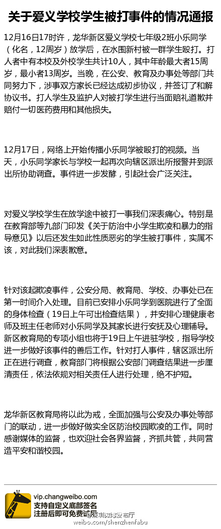 深圳新闻网讯 近日,深圳市龙华新区爱义学校发生一起校园暴力事件。该校一名 12 岁男同学小谢放学后在校外被十几名高年级学生拳打脚踢,还遭受了被迫下跪、自扇巴掌的羞辱,施暴者还将打人经过拍摄成一段长达 1 分 46 秒的视频并上传到网上,一时间引发大量关注。