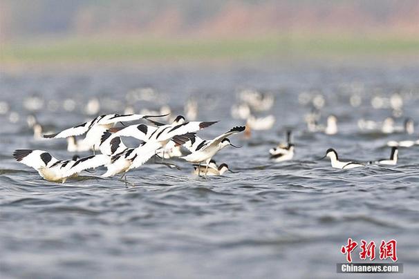 近日,一群反嘴鹬在湖南东洞庭湖国家级自然保护区振翅齐飞。据该保护区监测数据显示,至2016年11月底,为越冬而抵达长江两岸的湖南东洞庭湖和湖北洪湖的反嘴鹬达数万只。反嘴鹬是一种腿特别长的涉水鸟,它在沼泽中行走,嘴晃动镰刀一样向上弯曲,主要吃水里的昆虫、小鱼、贝类和两栖动物,目前已列入国家林业局2000年8月1日发布的《国家保护的有益的或者有重要经济、科学研究价值的陆生野生动物名录》。