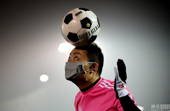 2015年1月15日,成都,南门一处足球公园内,坝坝球爱好者小吴和他队友顶着雾霾带着口罩踢足球。图/视觉中国