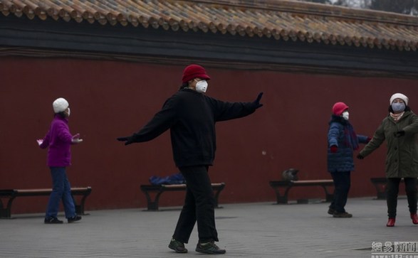 2014年02月21日,北京,市民戴着口罩在景山公园锻炼,当天是重度雾霾。图/视觉中国