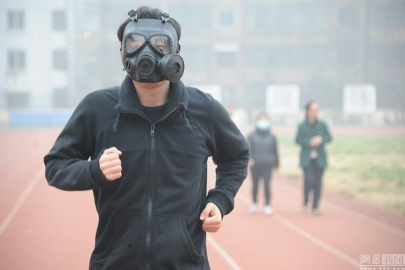 2015年11月11日,济南,位于山东师范大学校园操场上,一名大学生戴着防毒面具在操场上晨跑,吸引众多过客的目光。图/视觉中国
