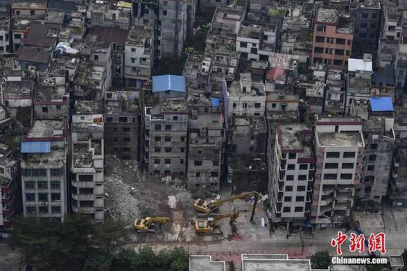12月21日,广州百年冼村,三台挖掘机正在对旧楼施工。拆迁启动的19日,“早上6点多,就开始放炮仗了,可能为了图个吉利,准备开拆。”19日上午的冼村比以往更热闹一些,在靠近冼村路的一块小小空地上,钩机已经进场,冼村实业有限公司一众人等也已经到场,并有少数村民围观。