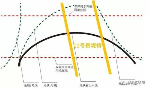 ▼双界河水廊道和11号景观桥项目涉及地铁保护施工区域示意图