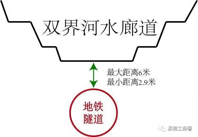双界河水廊道项目范围内涉及到4条地铁运营线路的保护,其中有3条线路(地铁5号线、1号线和车辆段左出入线)横穿河底(上图绿色虚线), 1条线路(车辆段右出入线)平行河道,位于左岸岸坡下(上图黑色粗线)。4条地铁线路距河底(或坡面)的埋深最小仅为2.9米,最大不过6米。