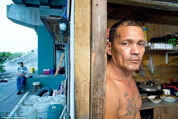 英国《每日邮报》报道,摄影师Mary Lou Uttermohlen在美国用镜头记录下了许多流浪者的日常生活照片。图为一名居住在迈阿密的性犯罪者聚集区的流浪者(右),他在这里有一间简易的房子,其中包括浴室和厕所,他还经常帮助一些新来的流浪者(左)。