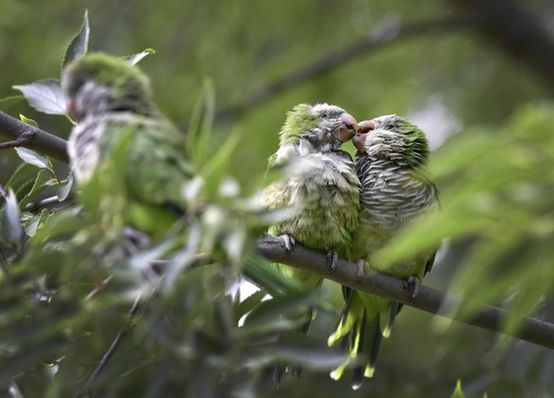 两只鹦鹉在马德里Atena公园内的树上休息,据了解,在当地动物区内,这种鹦鹉已经和麻雀与鸽子一样,成为了亟待解决的难题。