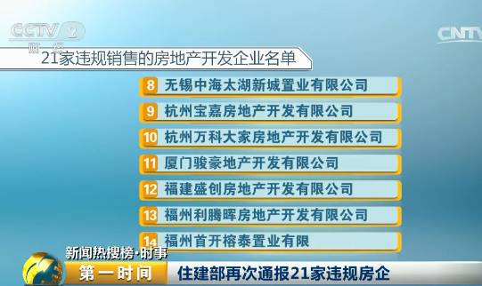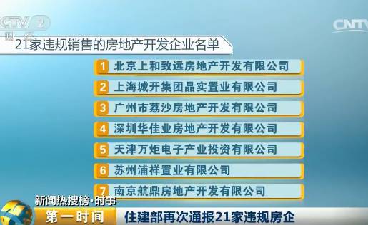 30号,住建部再次公布21家违规销售的房地产开发企业名单。这21家房地产企业主要涉及发布虚假房源信息和广告、捏造或者散布谣言、未取得预售许可证销售商品房、变相收取定金预订款、捂盘惜售,暗中加价收费等违法违规行为。