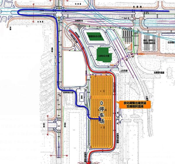 在口岸内部交通组织方面,记者了解到,交通部门将优化出境货车交通流线,调整出境货运交通组织,从原来D停车场西侧道路出境改为从东侧道路出境,避免社会车辆与出境货车通行交织。目前,该项措施作进一步观察评估,待完善相应配套设施设置后启用。