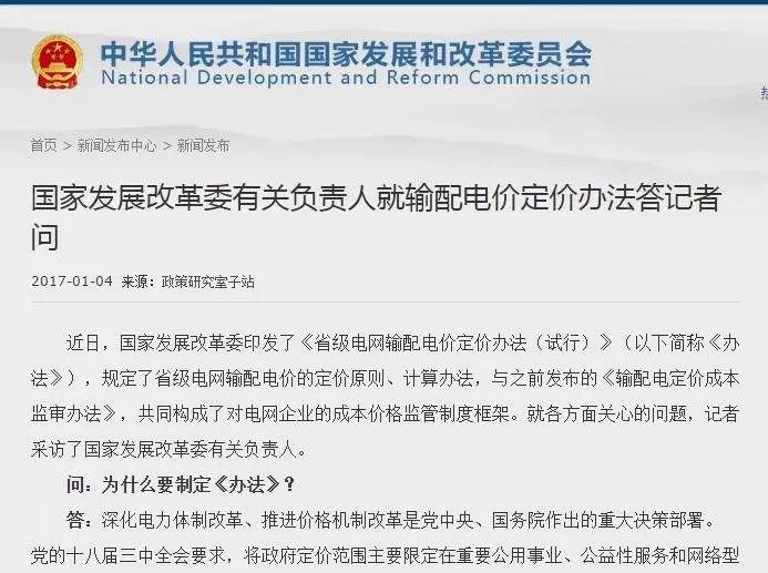 国家发改委发布省级电网输配电价定价办法