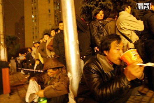 而对于中国人,对方便面更为独特的记忆是春运。泡面火腿的组合一度被称为“春运神器”,是高铁时代来临之前每个踏上春节返乡之旅的铁路乘客最为熟悉的“春运味道”。图为2005年1月25日晚9点40分,上海,虹口体育馆火车票大卖场民工和回家的人排起数千米长的队伍买票,一名排队男子吃方便面解饿。张海峰/视觉中国