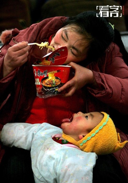 2006年1月18日,北京西客站候车室,一位母亲咬断方便面喂孩子。视觉中国