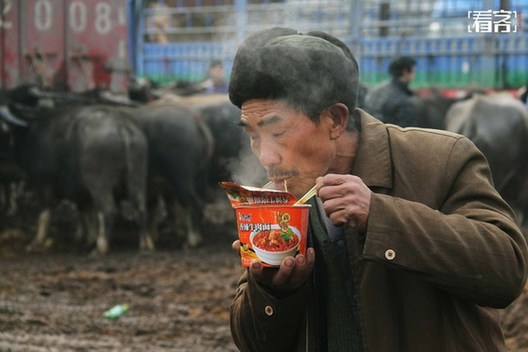 2013年1月2日,浙江金华,做贩牛生意的男子在牛市上吃方便面充饥。葛跃进/视觉中国