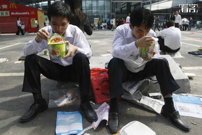 2007年11月24日,深圳举办的毕业生双选会上,两名求职者在吃泡面。单日/视觉中国
