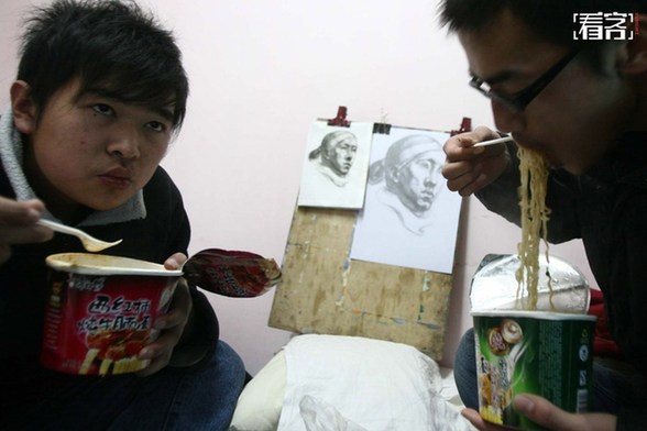 2008年2月18日,方便面和咸菜成为备战高考的艺术生的主食。何毅/视觉中国