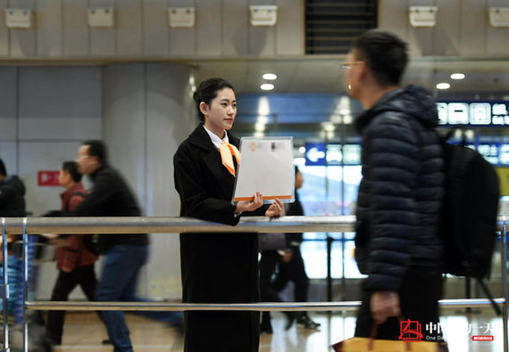 21岁的宫晓培是一名专车接机员。短短一年多时间,她从一个懵懂的职场“菜鸟”,变身专业的接机员领队。因为服务好、笑容亲切,她被同事和客户称为“最美接机员”。(图/张伟文/储佳)