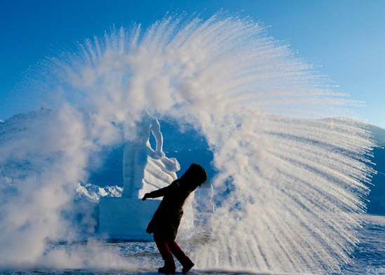 2017年1月11日消息,新疆阿勒泰。10日是“三九”的第三天。中国新疆阿勒泰地区的可可托海镇,这里1月为全年最冷月,平均气温在-37度。市民在玩“泼水成冰”。图/视觉中国