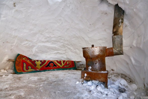 用雪堆成的毡房,里面有长凳和炉子。图/视觉中国