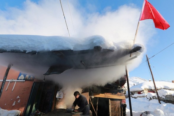 如今镇上共有5个打馕师傅,每天每人要用掉25公斤面粉,打出100多个馕。这里晚上气温降到了零下30度以下,放在室外的车辆都发动不着了,连街道上的铜质雕塑上面都是一层霜。但是打馕师傅就已经开始烧热馕坑,开始一天的劳作。图/视觉中国