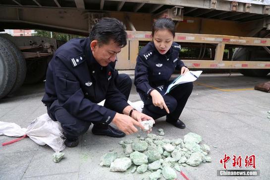 1月12日上午,海口海关召开新闻发布会,通报近日捣毁的4团伙走私近20亿元人民币宝石大案。据悉,该案20名主要目标嫌疑人全部到案,现场查扣琥珀、查罗石、玉石等各类原石及成品近60吨。海口海关相关负责人表示,上述案件是近年以来中国海关缉私部门查获的案值最大宗走私进口宝石案。图为海关缉私警察查验走私宝石原料现场。中新社发海口海关供图