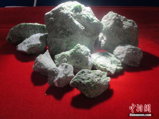 1月12日上午,海口海关召开新闻发布会,通报近日捣毁的4团伙走私近20亿元人民币宝石大案。据悉,该案20名主要目标嫌疑人全部到案,现场查扣琥珀、查罗石、玉石等各类原石及成品近60吨。图为海口海关展示查获的走私宝石原料。中新社记者付美斌摄