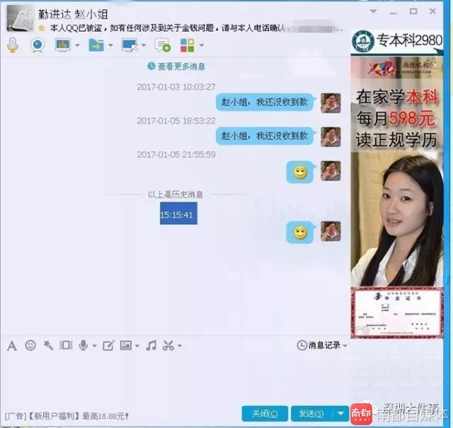 何先生说,自己没有留对方财务的电话,平常都是通过上面老总对接。他怀疑,骗子可能是入侵了付款公司的电脑,或是盗取了对方财务的QQ号,但自己也不能确定。