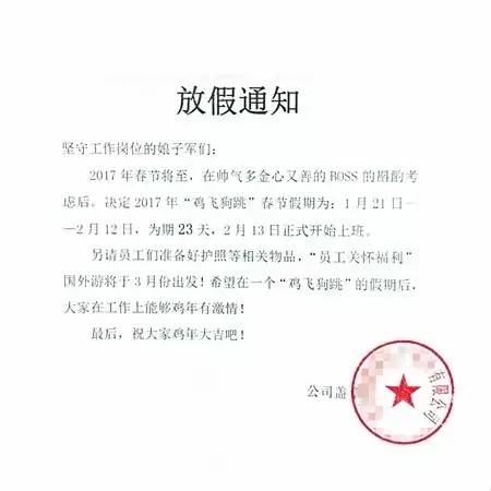 好消息:春节放假从1月21-2月13日,共23天!带薪休假!!上班后组织 国外旅游!!!
