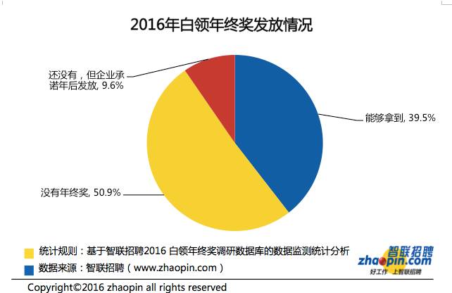 调查显示,只有39.5%的白领表示可以拿到年终奖,明显高于2015年13.4%的比例,另外有9.6%的白领表示企业承诺会在年后发放年终奖。